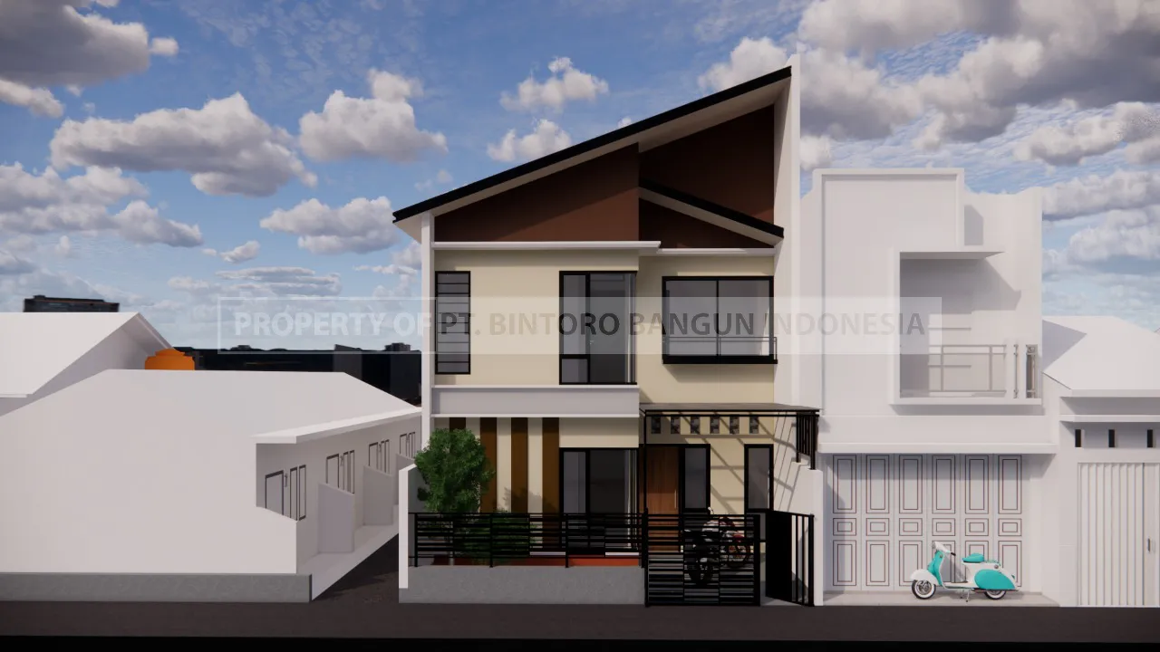 Rumah dua lantai bergaya Modern Minimalis ini tampil elegan dengan bentuk kotak (kubisme) yang tegas dan clean. Fasadnya mengedepankan komposisi material premium yang harmonis: perpaduan warna netral seperti abu-abu dan krem, aksen panel kayu yang hangat, serta bingkai jendela minimalis berwarna gelap. Garis-garis arsitektur yang bersih dan pencahayaan aksen yang cermat menciptakan tampilan yang mewah, kokoh, dan berkarakter, ideal untuk gaya hidup kontemporer.