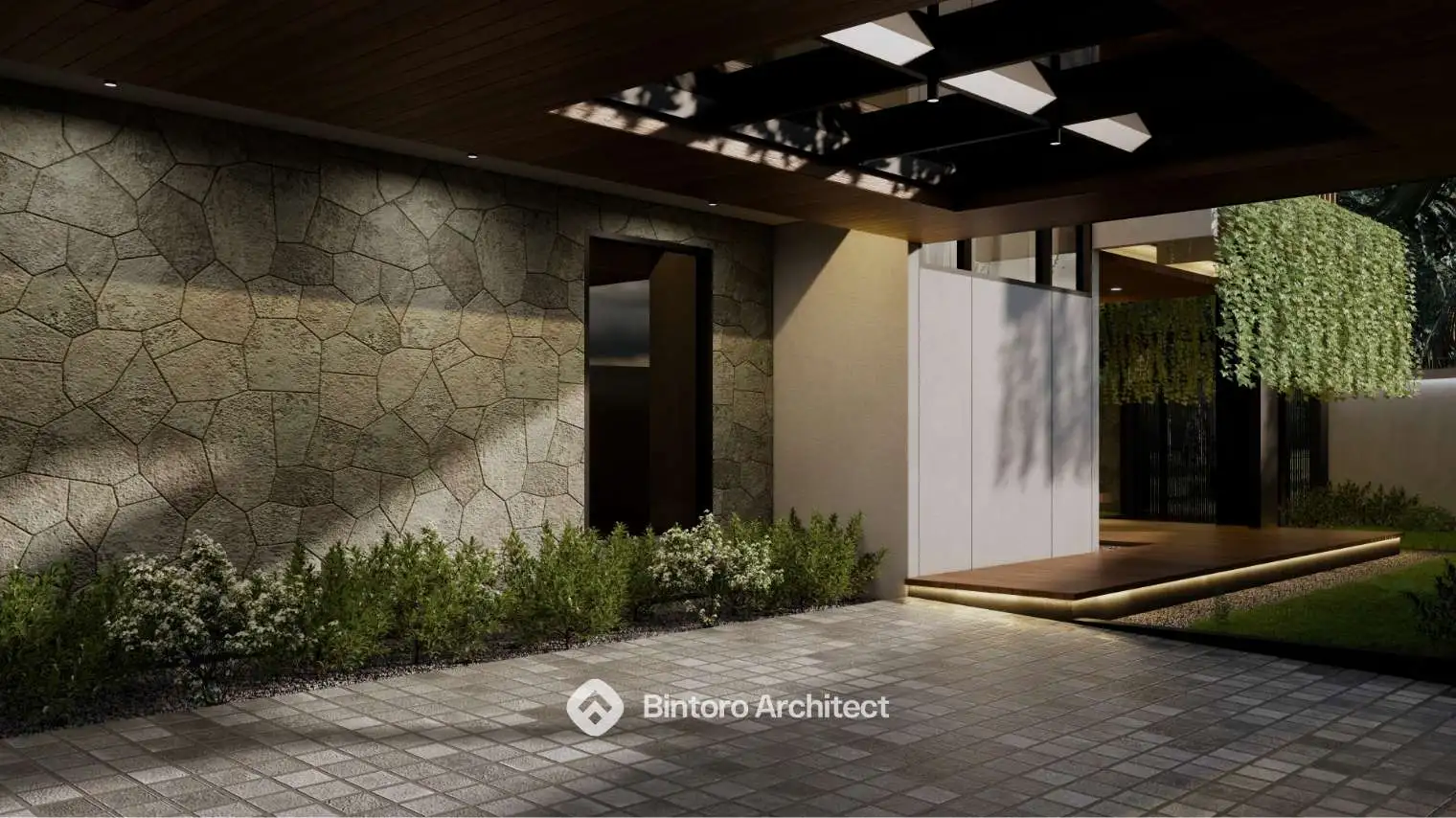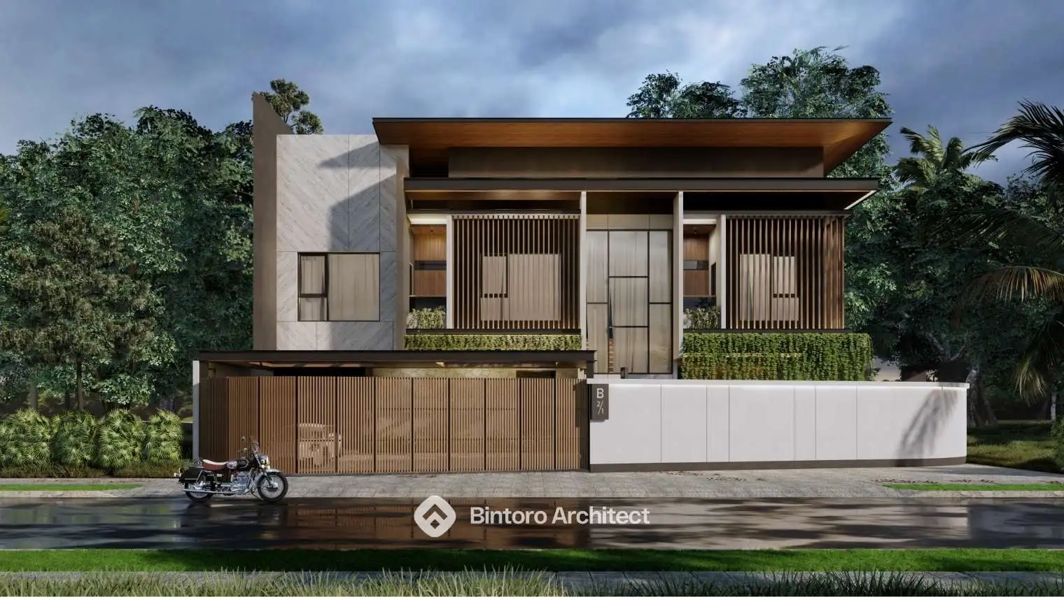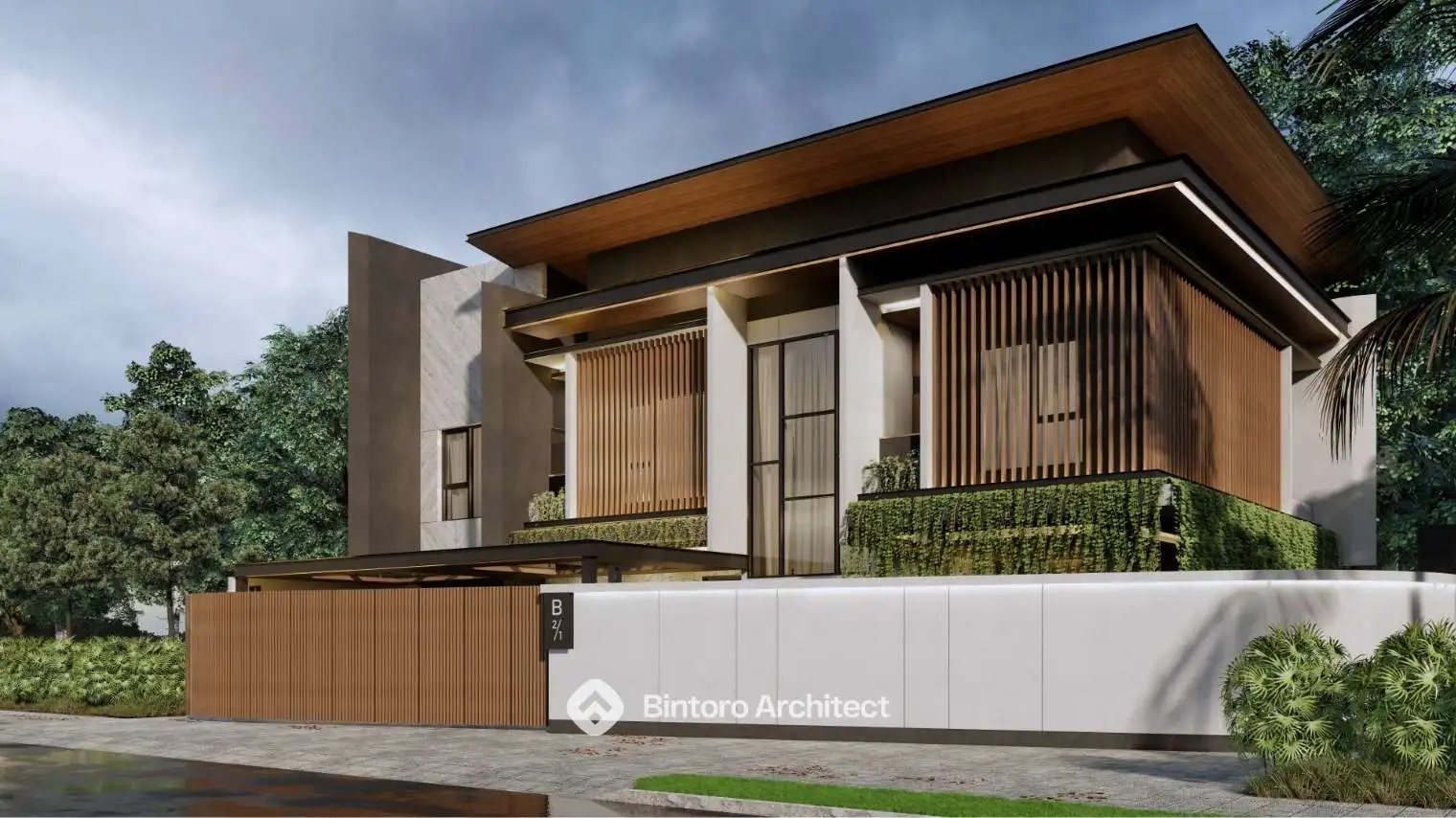 Konsep modern tropis yang mengutamakan kenyamanan iklim, visual fasad yang bersih, serta kesan hangat pada setiap sudut bangunan. Dirancang secara detail oleh Jasa Desain Rumah Profesional Bintoro Architect.