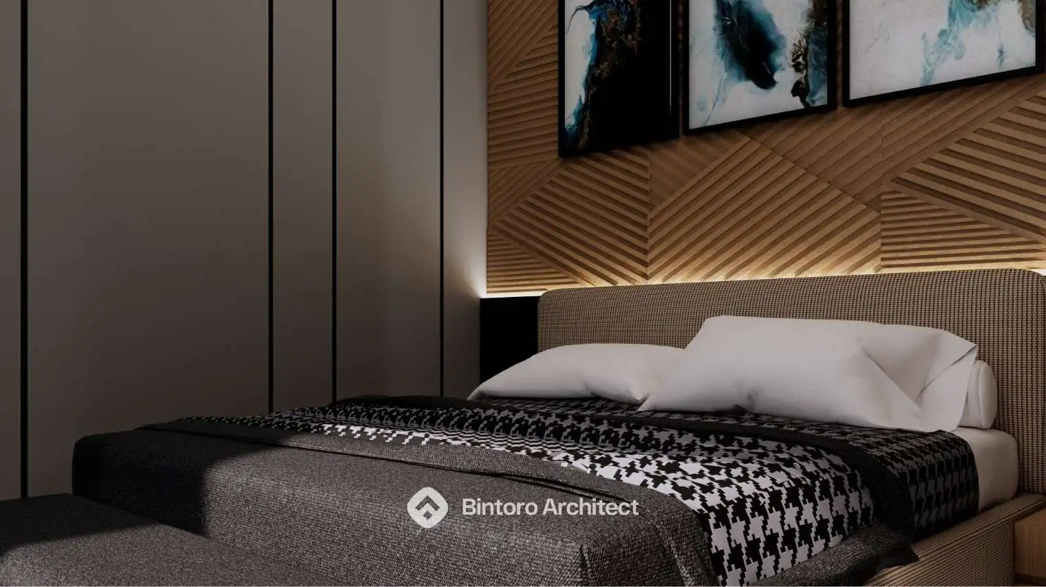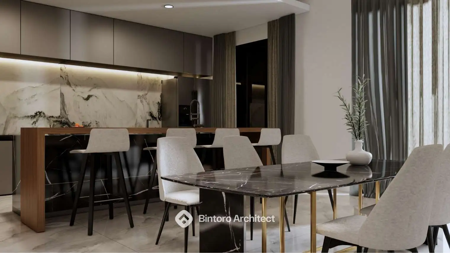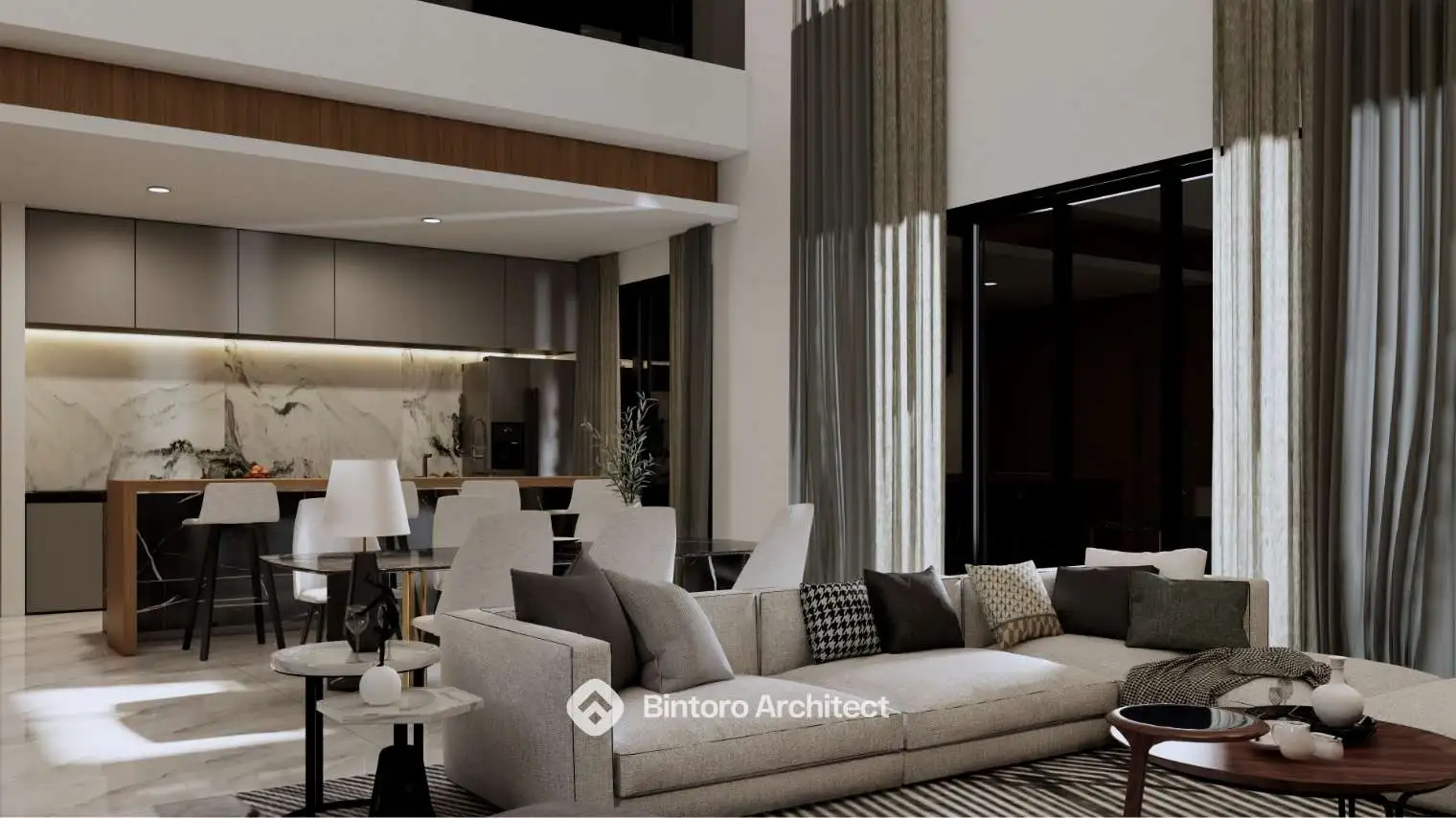 Konsep modern tropis yang mengutamakan kenyamanan iklim, visual fasad yang bersih, serta kesan hangat pada setiap sudut bangunan. Dirancang secara detail oleh Jasa Desain Rumah Profesional Bintoro Architect.