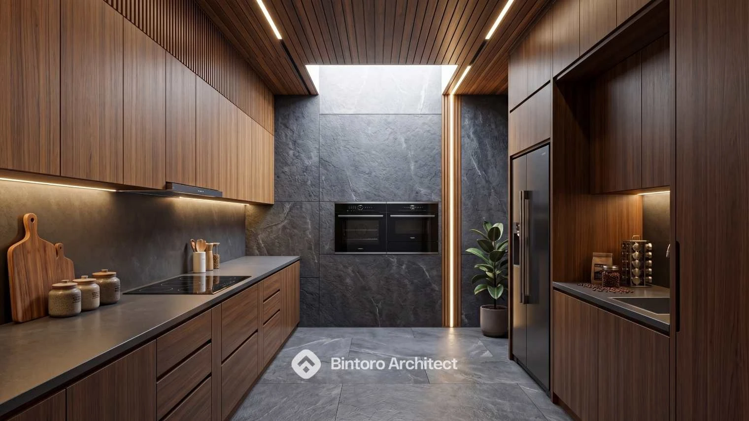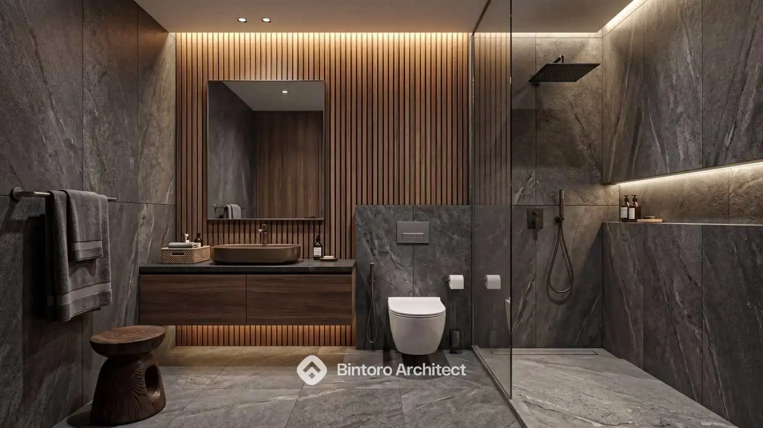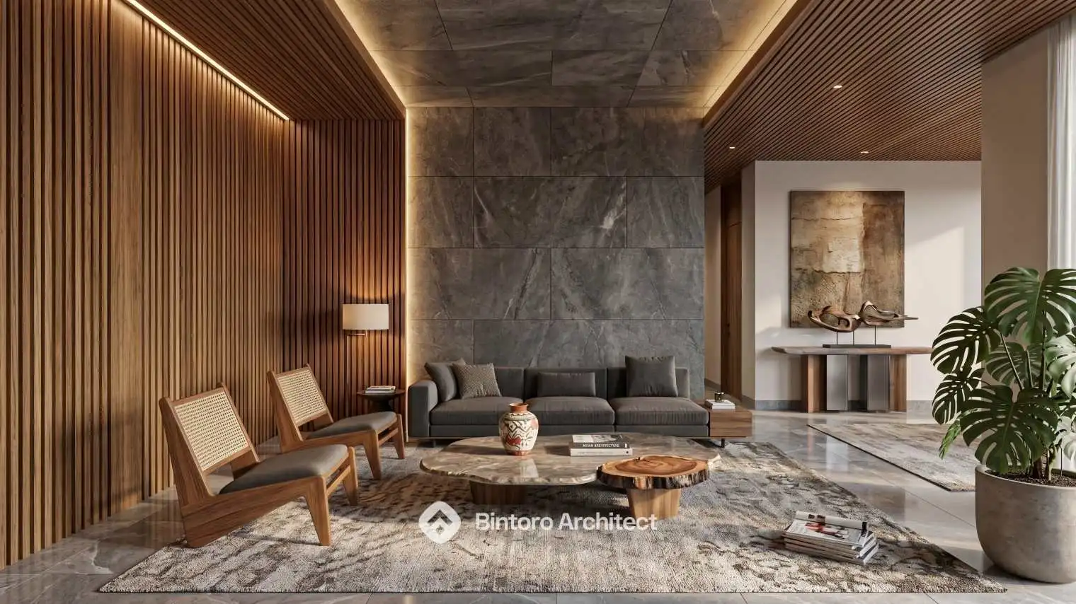 Masuk ke area interior, suasana hangat dan elegan langsung terasa melalui penggunaan marmer abu-abu gelap, plafon kayu, serta pencahayaan tersembunyi yang membuat ruang terlihat lebih dramatis. Setiap detail dirancang dengan cermat agar tidak hanya indah secara visual, tetapi juga nyaman untuk aktivitas sehari-hari.