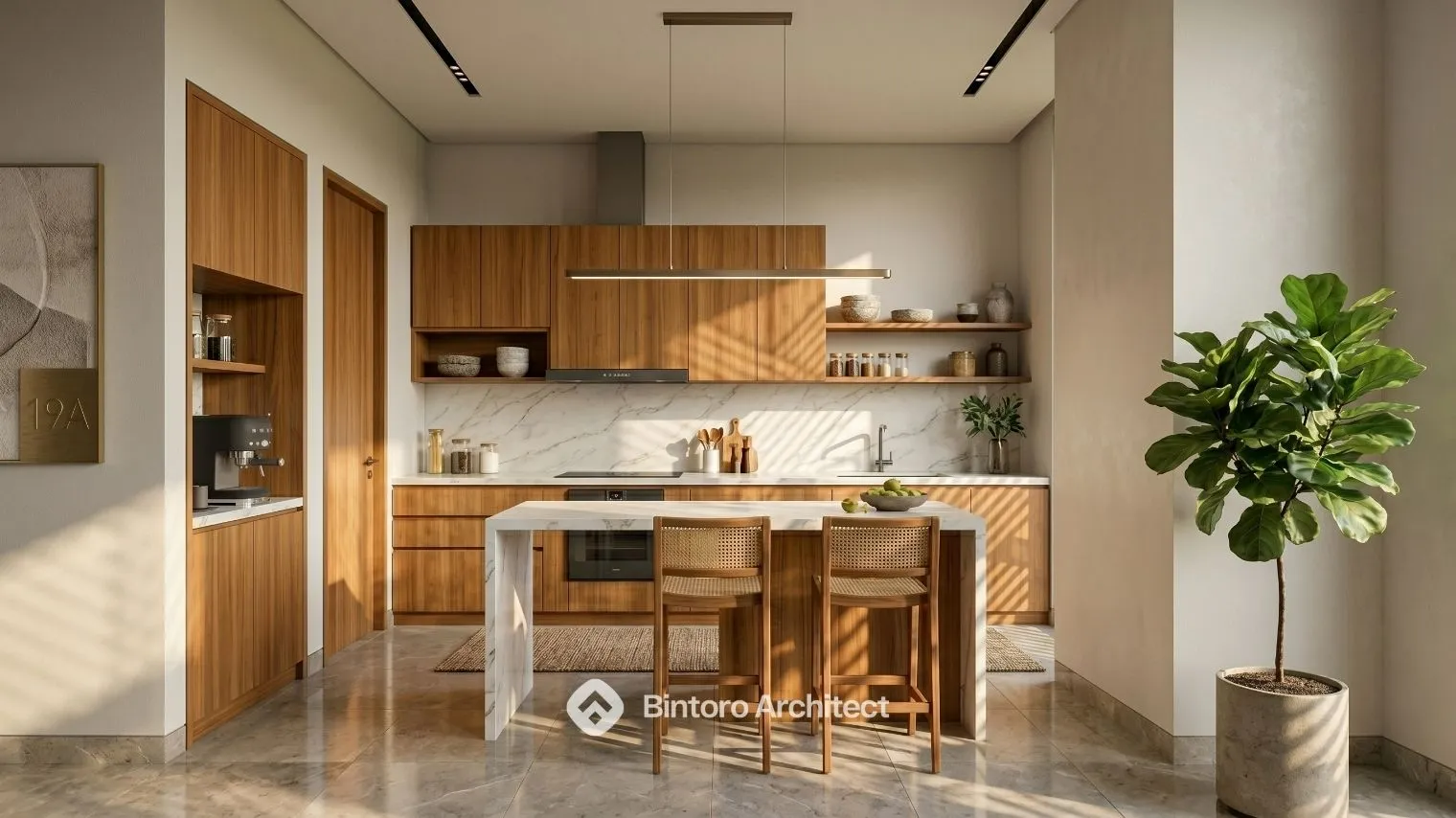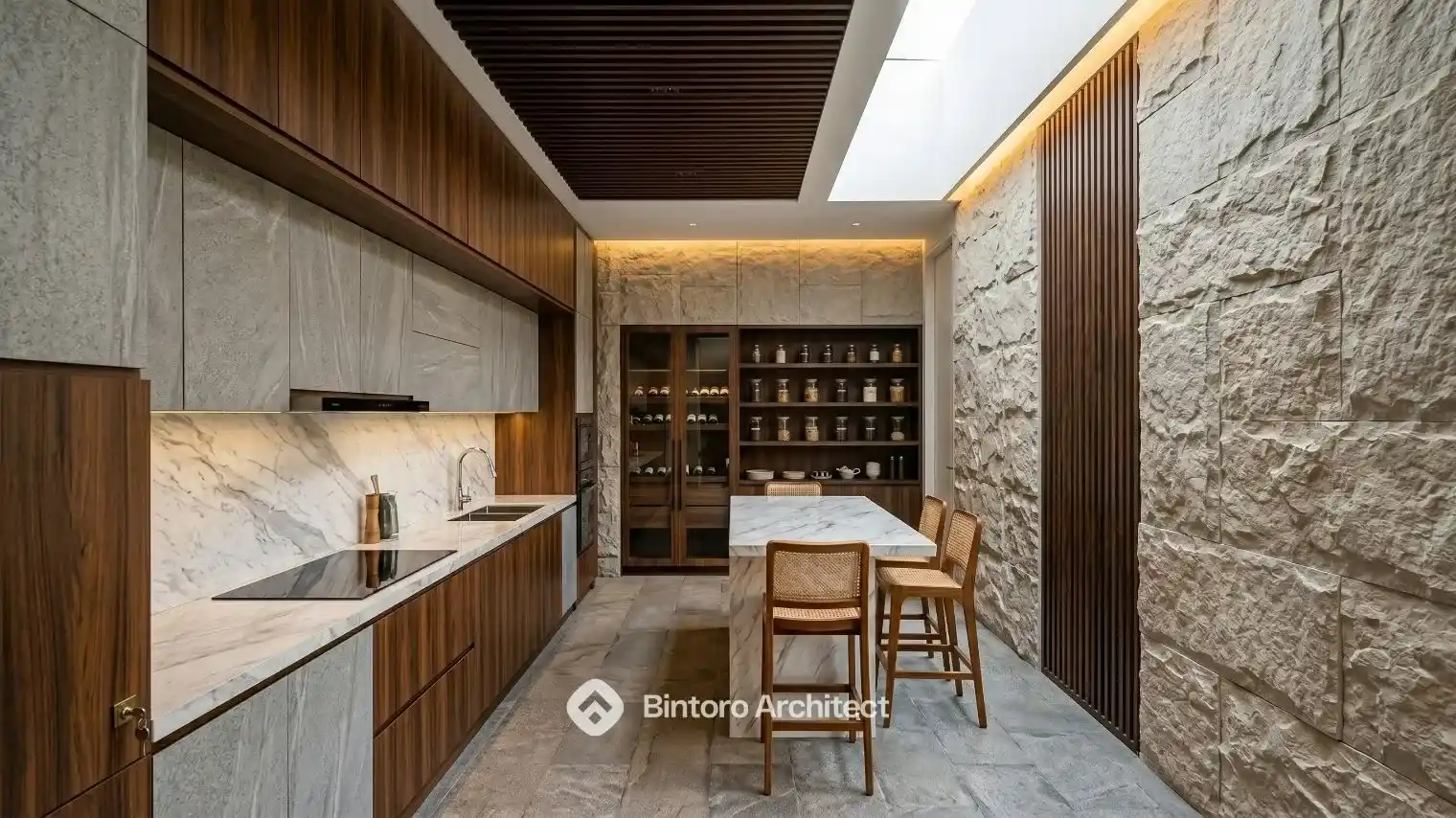 Masuk ke area interior, suasana mewah namun tetap nyaman terasa melalui penggunaan palet warna bumi yang didominasi material kayu jati, batu alam, dan marmer. Konsep ruang terbuka dengan plafon tinggi menghadirkan kesan lapang, didukung pencahayaan alami dari bukaan besar serta skylight pada area tertentu. Detail seperti dapur dengan island marmer, dinding bertekstur, hingga kamar tidur dengan panel kayu dan lantai parket dirancang untuk menciptakan pengalaman ruang yang hangat dan fungsional.